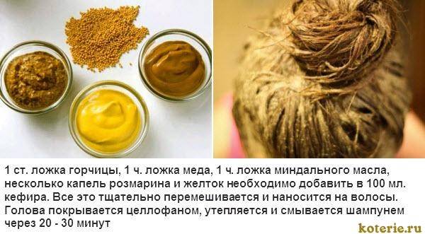Две столовые ложки меда заливаем 100 мл кефира и ждем, пока начнется интенсивное брожение, добавляем две столовые ложки меда и тщательно перемешиваем. Наносим на корни волос, надеваем шапочку для душа и оборачиваем голову махровым полотенцем. Смываем через 40 минут. Рекомендуется повторять процедуру раз в 10 дней.