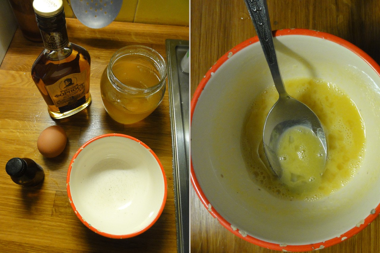 Желток смешивается с теплым медом, а уже потом с коньяком. Сначала маска втирается в корень, а потом растягивается по влажным волосам. Нужно сидеть с ней 30 минут.