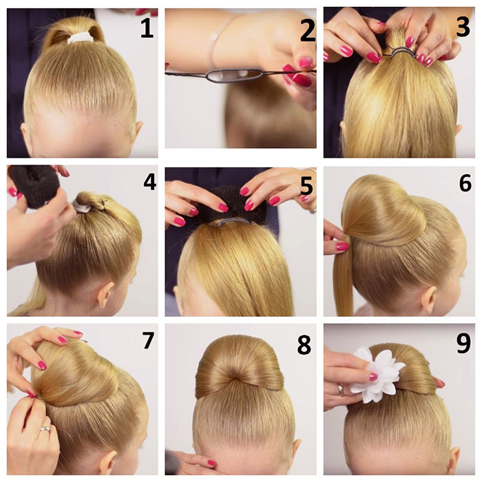 Прическа выполняется немного необычным способом. Для создания ее понадобится бублик или валик, который надо закрепить в области макушки. Далее следовать инструкциям, приведенным на фото.