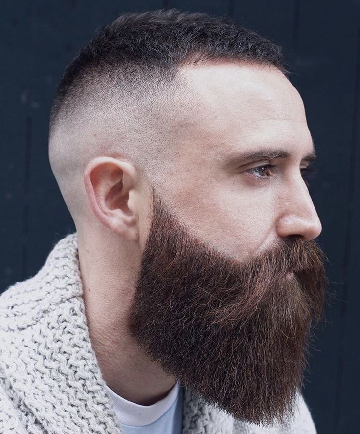 Под ноль – стрижка наголо в сочетании с бородой приобретает все большую популярность. Подходит мужчинам с ровной формой головы и правильными чертами лица.