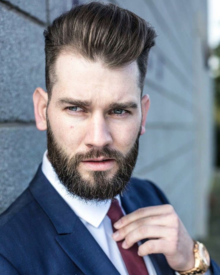 Короткие виски в сочетании с объемным верхом создают элегантный образ и в тоже время мужественный, особенно в сочетании с бородой.