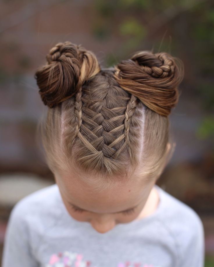 Для достижения этой прически волосы заплетаются в большие пучки по-голландски. Все, что вам нужно сделать, это разделить волосы вашей маленькой девочки по центру, начиная с затылка и заканчивая шеей. Приступайте к плетению голландской косы от шеи вверх и скручивайте косички в булочки. Следует отметить, что эта прическа может лучше подойти для детей с длинными волосами.
