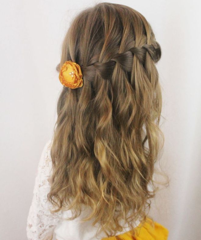 Начните с расчесывания волос вашей маленькой девочки до одной стороны. После этого завяжите французскую косу от средней вершины. Как и ожидалось, вам нужно будет добавить к нему немного стиля. В дополнение к аксессуарам можно выпустить немного бахромы спереди и скосить ее сбоку.