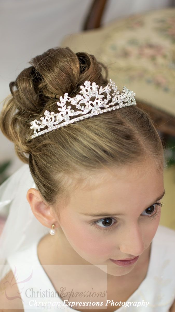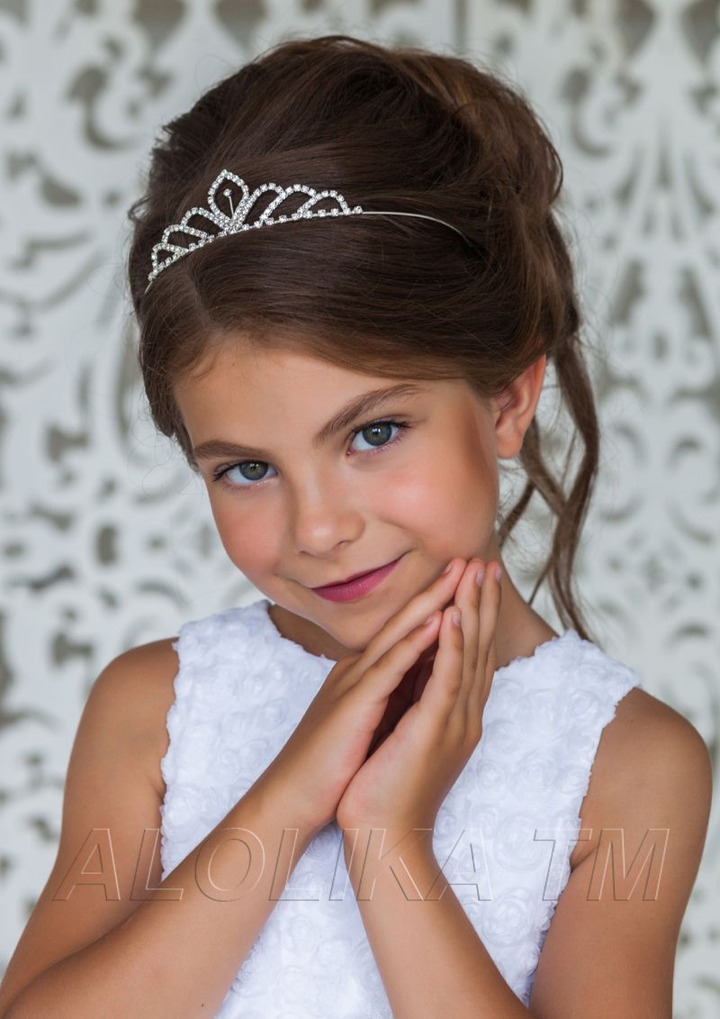 Не менее популярны классические высокие укладки с полностью собранными гладко уложенными в пучок волосами. Для их создания потребуется специальный аксессуар – поролоновый валик, вокруг которого крепятся пряди. Его предназначение – создание недостающего объема без начесывания тонких детских локонов. Диадему крепят на макушке, обрамляя контур укладки. В окончательном варианте прическа смотрится крайне выигрышно, особенно, если для праздничного образа выбрано пышное платье.