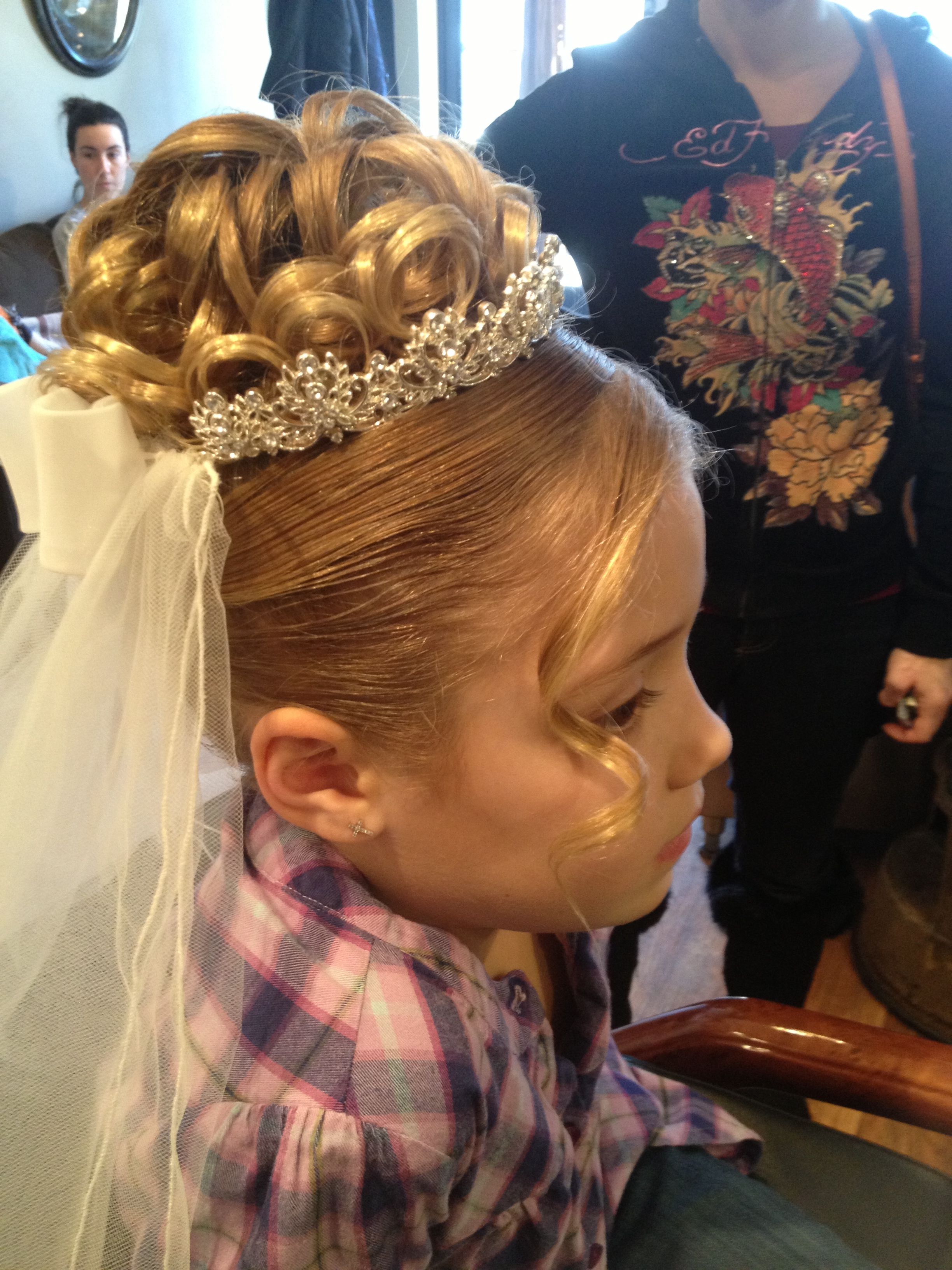 Детская прическа на длинные волосы с диадемой