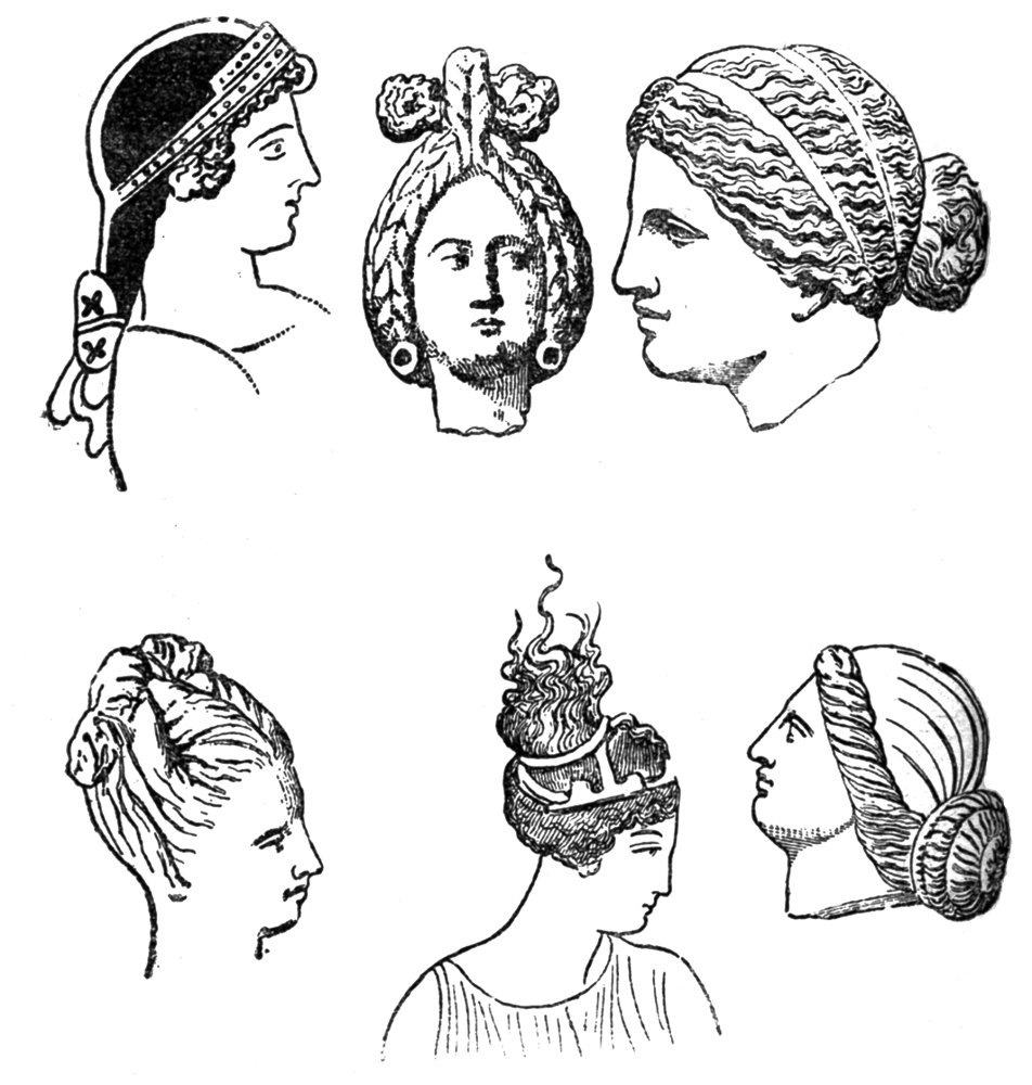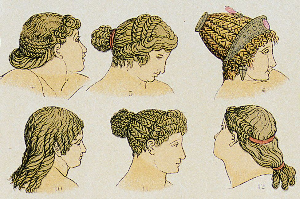В Древней Греции ценились волнистые волосы солнечных оттенков, поэтому темные волосы осветляли, часть их поднимали к затылку, скручивая в узел, скрепляя лентами или шпильками. Простые жительницы носили обычную греческую косу вокруг головы, или распущенные и сколотые по бокам волосы.