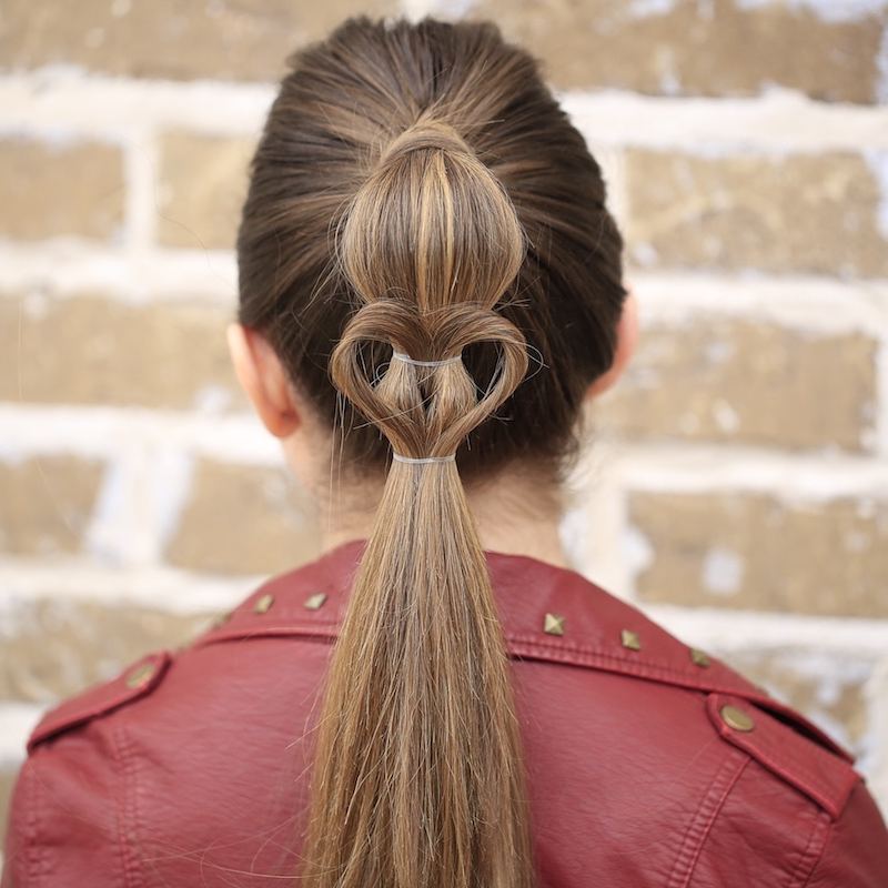 Волосы нужно завязать в хвостик, но пропустить небольшую его часть не до конца. Теперь разделяем на две половинки, а оставшийся хвостик протягиваем наверх, как будто формируя основание банта.