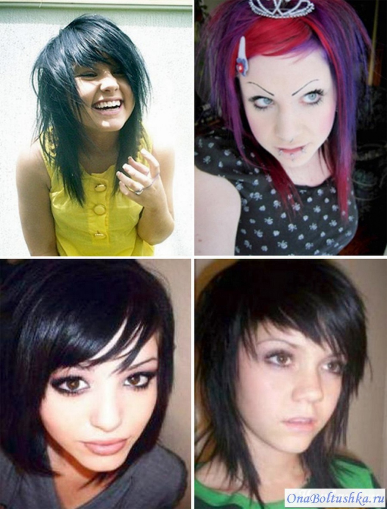 Эмо прически для девушек в основном подходят для волос, длина которых может доходить до верхней границы талии. Средняя стрижка подразумевает длину ниже плеч. Такие прически представляют собой рваную стрижку или же каскад по всей длине. Главная особенность эмо — длинная асимметричная челка, зачесанная на бок. Спереди волосы должны быть длиннее, чем сзади. На макушке же значительно укорачиваются. По всей длине наблюдается неравномерное соотношение коротких и длинных прядей.