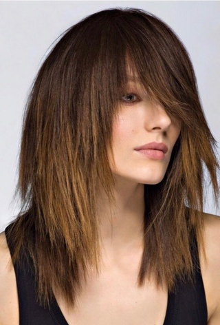 Чтобы укладка выглядела красиво и аккуратно, нужно хорошо расчесывать пряди от макушки, каждый раз двигаясь в противоположную сторону. Вариант прически каскад на средние волосы с челкой подойдет абсолютно всем. Но не забывайте вовремя филировать челку и подрезать кончики.