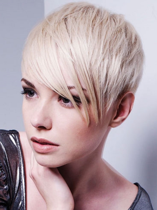 Эта очень короткая стрижка с длинной челкой для женщин сделает ее обладательницу модной и экстравагантной. Асимметричные слои по бокам и сзади создадут необходимую текстуру. Все волосы сверху переходят в челку, ниспадающую на лоб. Окрашивание в платиновые оттенки идеально подчеркнет и дополнит образ.