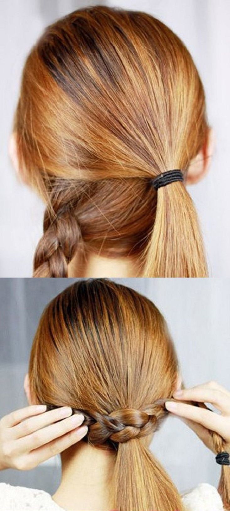 На затылке собираем волосы в хвост, захватывая туда косичку. Небольшой прядкой следует обернуть основание хвоста, чтобы скрыть резинку. Можно еще для надежности закрепить шпильками.