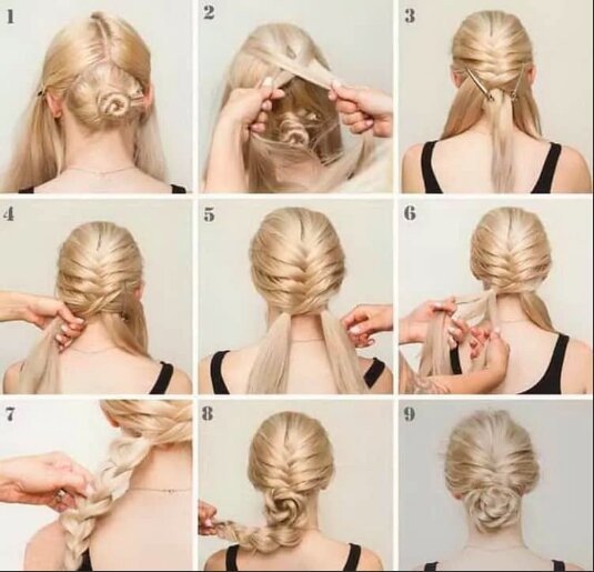 Эта прическа подойдет для обладательниц длинных волос, сначала сделайте хвост, потом заплетите несколько косичек и все красиво закрутите в пучок.