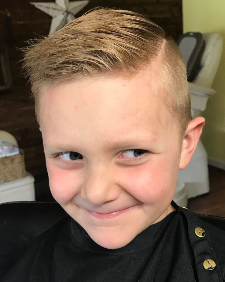 Самый актуальный вариант для летней жары — коротко остриженные виски и затылок и более длинные пряди на макушке. Эта прическа, в зависимости от укладки, может превратить малыша как в бунтаря, так и в стильного денди. Безо всякой укладки она тоже смотрится прекрасно. Подходит любому типу волос, особенно мальчикам с прямыми упрямыми волосами, которым трудно выбрать стрижку.