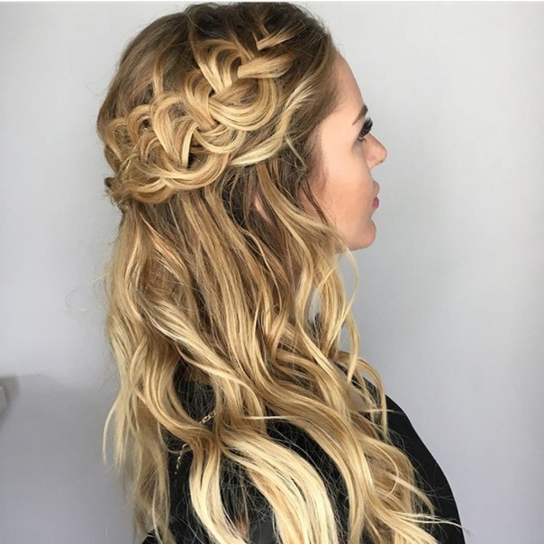 Обладательницы длинных волос могут сделать как крупные локоны, так и мелкие кудряшки. Удачное дополнение прически – косы. Плетения уже который год на пике популярности, к тому же, их можно сделать заранее, что сильно сэкономит время перед самой вечеринкой.