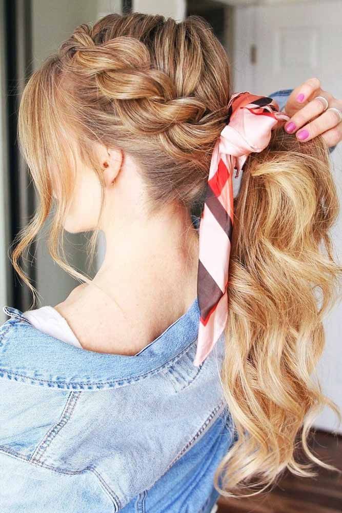 Это заставит ваши волосы падать с каждой стороны. С помощью резинки соберите волосы в высокий хвост. Возьмите две-три косы и оберните их вокруг основы, чтобы скрыть резинку от глаз.