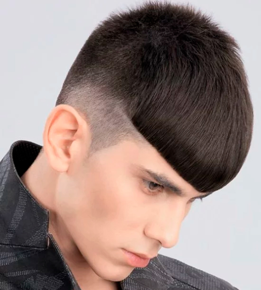 Модель выполняется на ультра-коротких волосах и средней длине. Ее особенности – коротко стриженый затылок и виски, длина 3–4 см на макушке, четкая окантовка, выполненная выше самой высокой точки затылка.