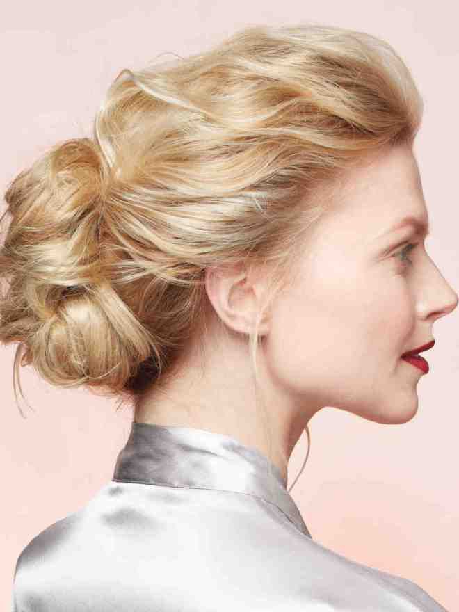 Соберите волосы в небрежный низкий узел, закрепите резинкой для волос, сверху наденьте резинку для волос, затем пальцами взлохматите корни.