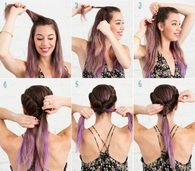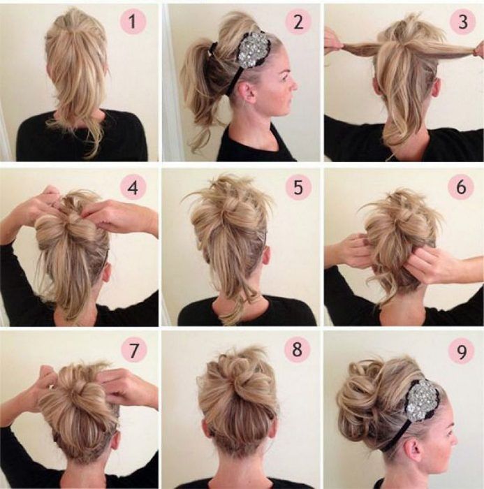 - Соберите волосы в высокий хвост, можно гладкий, можно немного растрепанный. Затем повяжите его у основания резинкой и кончик самого хвостика не до конца просуньте в него. Основную часть волос вам нужно разделить на две петли и кончиком хвостика обернуть серединку петелек.