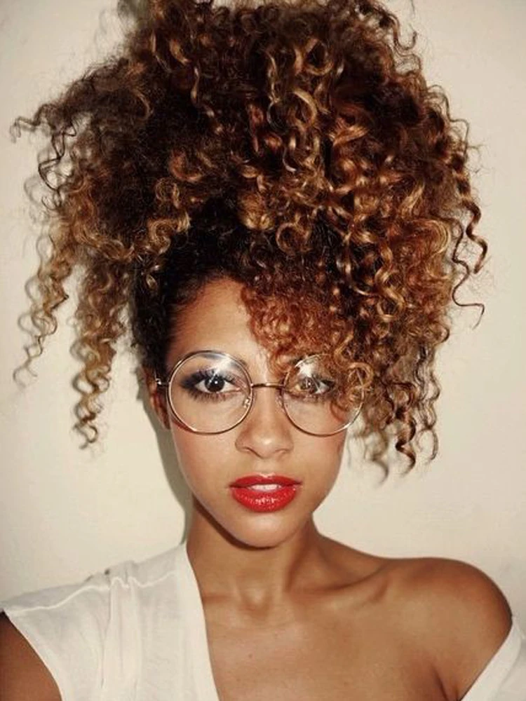 Один из самых популярных способов оживить кудрявые прически чернокожих женщин — придать им очаровательный штрих, особенно контрастные светлые блики. Эта игра цвета делает текстуру локонов еще глубже, подчеркивает темные глаза девушки, добавляет образу игривости.