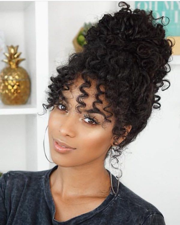 Кудрявый пуф.Ищете легкие короткие вьющиеся прически для темнокожих женщин? Высокий кудрявый пони (некоторые из нас называют его ананасом) — идеальный стиль для непринужденных дней.