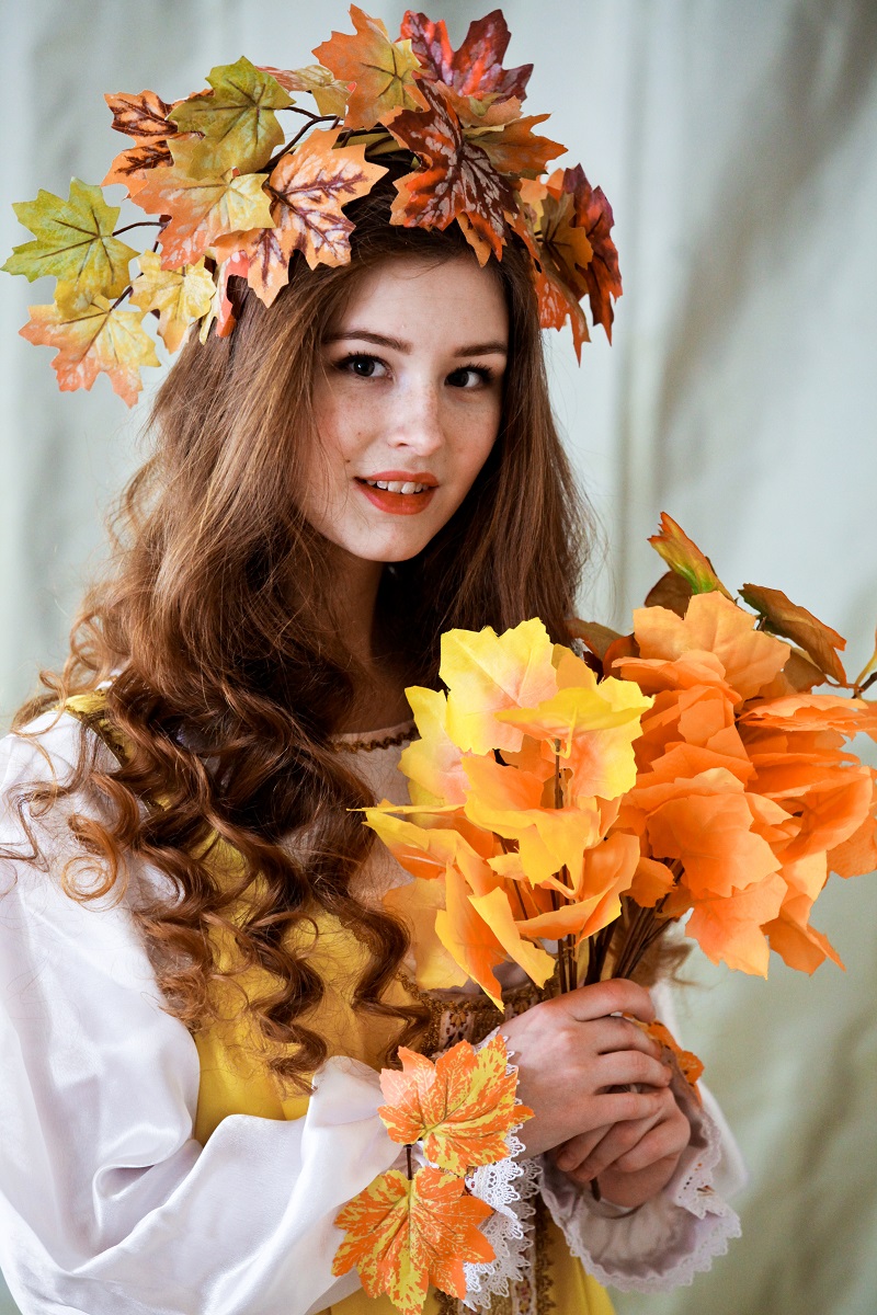 Продумайте соответствующее наряду украшение на голову: шапку с листьями или с пустыми ветками, листву которых уже почти унес осенний ветер.