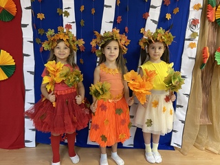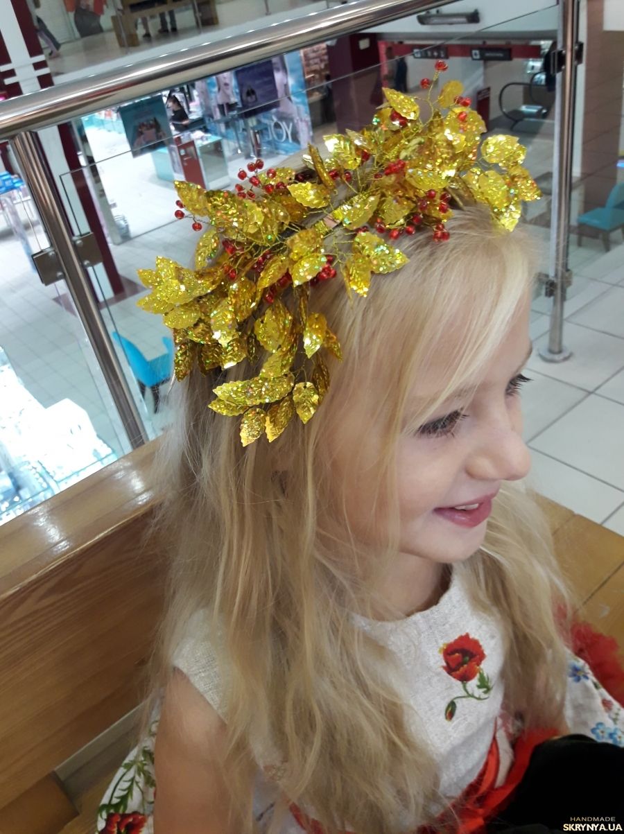 Придумайте украшение на голову, подходящее к платью. Это может быть шапка из осенних листьев и плодов рябины, украшенный листьями обруч или резинки для хвостиков.