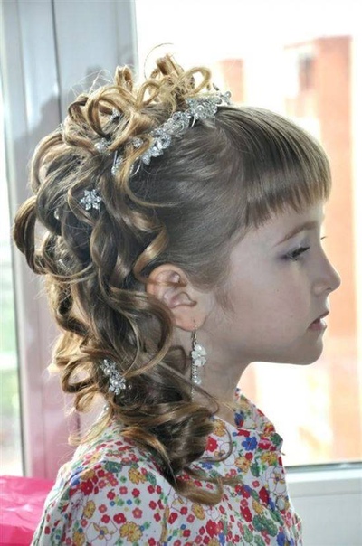 Украшают такую укладку диадемой, короной, заколками у висков, обручем. Завитки могут быть тугими, спиральными, волнистыми или озорными в зависимости от длины, структуры волос дочери.