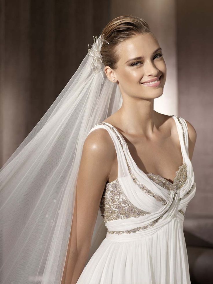 - Простые, легкие и лаконичные свадебные изделия замечательно комбинируются с классическими прическами на основе аккуратных пучков, узлов и мягких локонов.