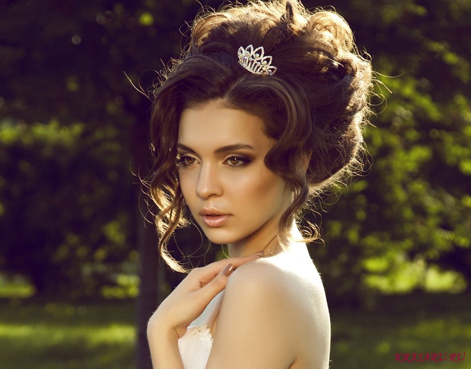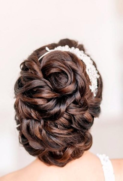 В темных прядях очень эффектно будут смотреться как белоснежные цветы, так и сверкающие диадемы или гребешки — дело только за фантазией стилиста и невесты.