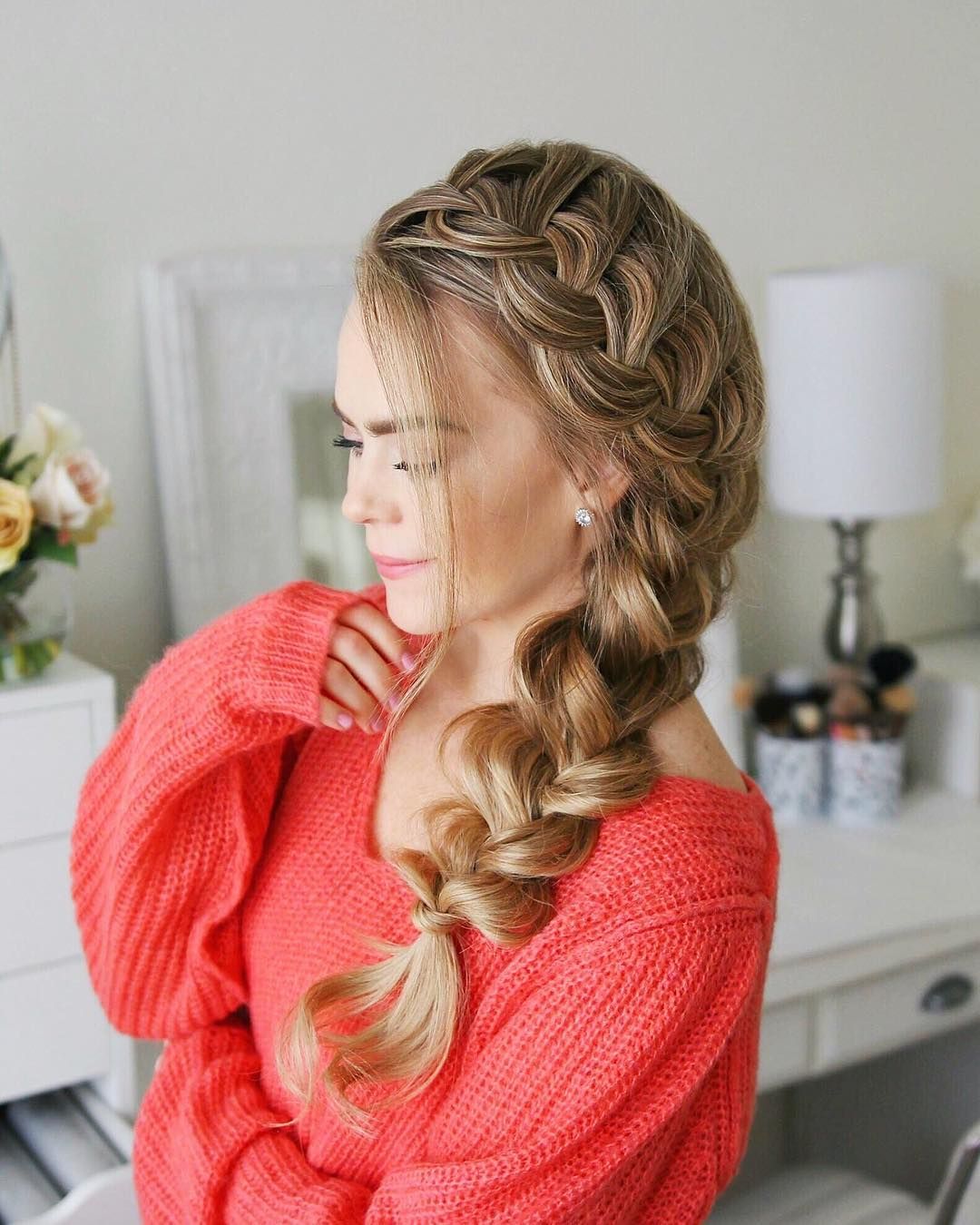 Теплая бежево-блондинистая плетеная прическа для густых волос