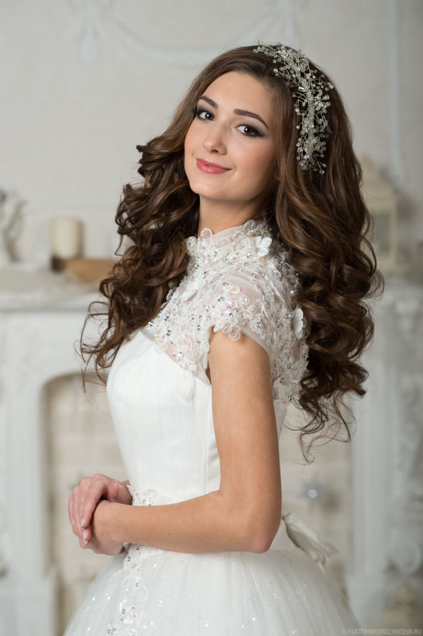 Для классической свадьбы подойдут аккуратно уложенные завитки и прическа в стиле «Мальвина». Этот вариант укладки наиболее популярен, так как невеста выглядит неотразимо.