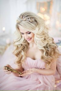 Всю массу волос раздели на отдельные прядки, накрути. Не причесываясь расческой, разбери завитки и сформируй высокую прическу, если предполагается в качестве украшения диадема. Или оставь их распущенными.