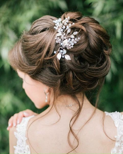 В свадебных прическах очень круто будут смотреться модные украшения с жемчугом, уместной будет и роскошная заколка с цветочками, напоминающая веточку.