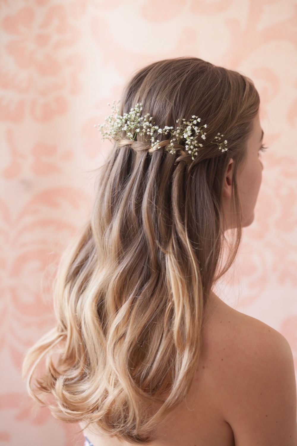 Полураспущенные волосы в обрамлении двух накрученных прядей ото лба к затылку отлично подходят под нежные и воздушные платья и юбки.
