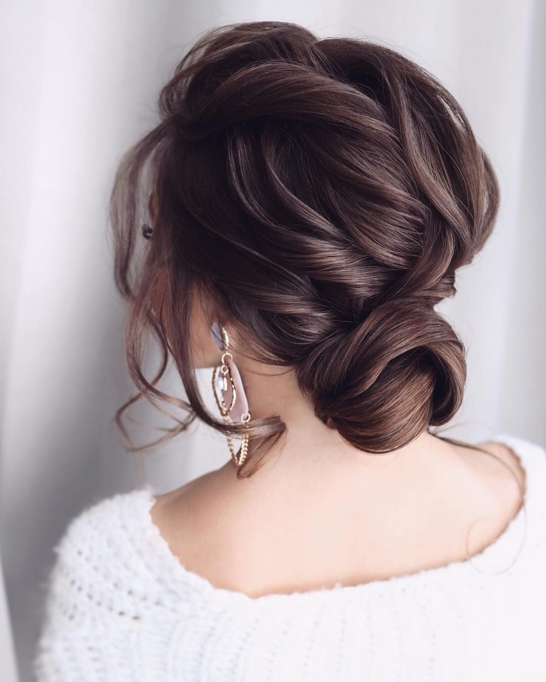 К такой прическе подойдет длинное платье с декольте насыщенного цвета и длинные серьги, которые подчеркнут красоту женской шеи.