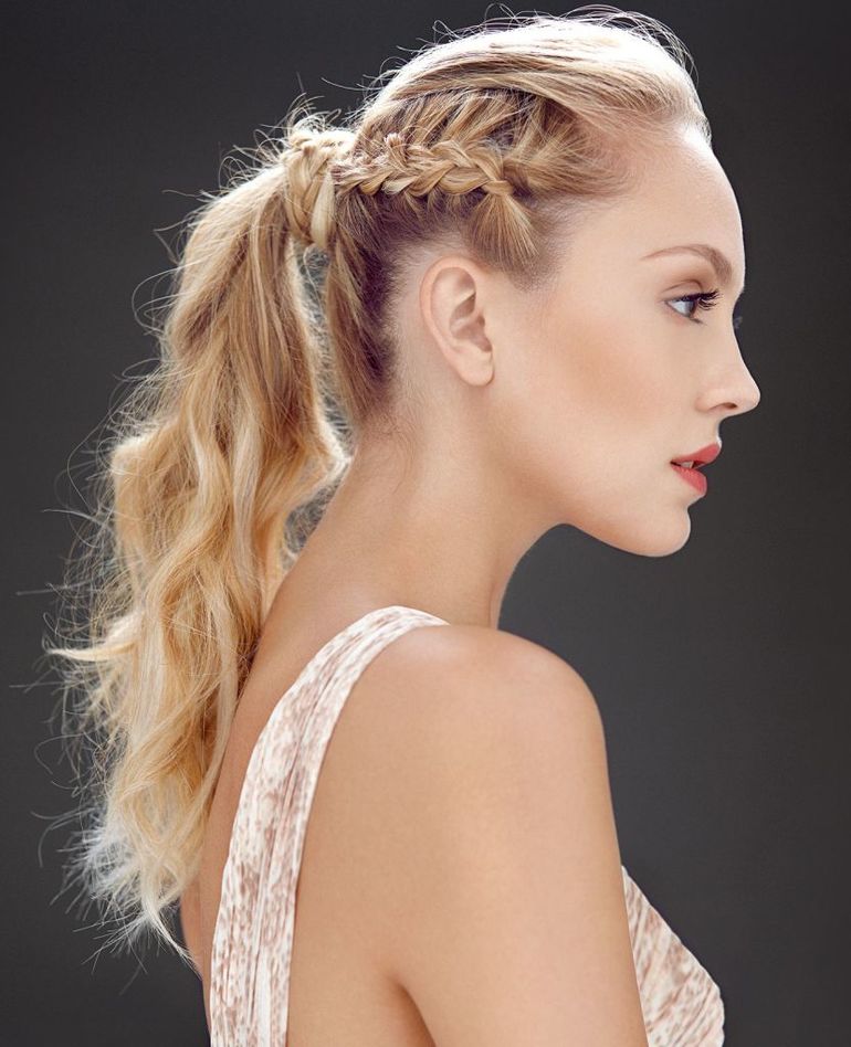Изюминка этой смелой и эффектной прически — французская коса на макушке. При нетугом плетении она получается объемной и напоминает ирокез. Для контраста гладко зачешите волосы по бокам и соберите в хвост. Если позволяет время, создайте объемные локоны — так прическа будет выглядеть еще лучше.