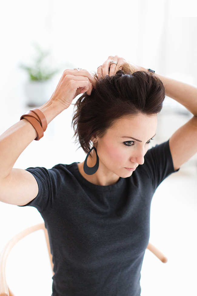 Возьмите свой первый хвостик и оберните им основу, чтобы получился пучок.Бобби прикалывает булочку на место. Проделайте то же самое со вторым хвостиком, убедившись, что ваши булочки выглядят так же!