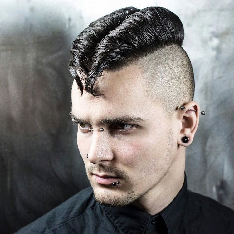 Они достаточно стильные, делают образ мужчины брутальным. В такой прическе часто присутствует асимметрия. Например, челка, постриженная «углом», либо хохолок сверху. Виски в таком случае убирают практически полностью.