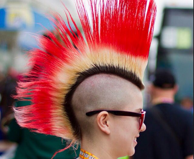 - Стиль панк предполагает наличие мужской прически с хохолком. На макушке стилист обязательно оставляет длинные пряди, предварительно их филируя. При укладке пряди волос начесываются, создавая объем от корней. Часто пряди окрашивают в цвета, отличные от натуральных.