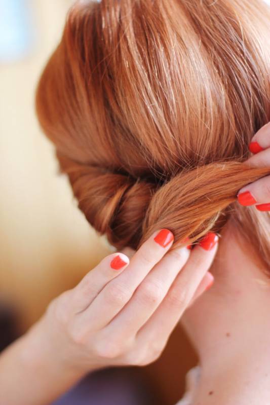 Просуньте под него руку и пальцами проделайте в волосах дырку. Выверните в это отверстие хвост — так вы спрячете резинку. Оставшуюся часть хвоста расчешите, сверните улиткой и зафиксируйте при помощи шпилек.