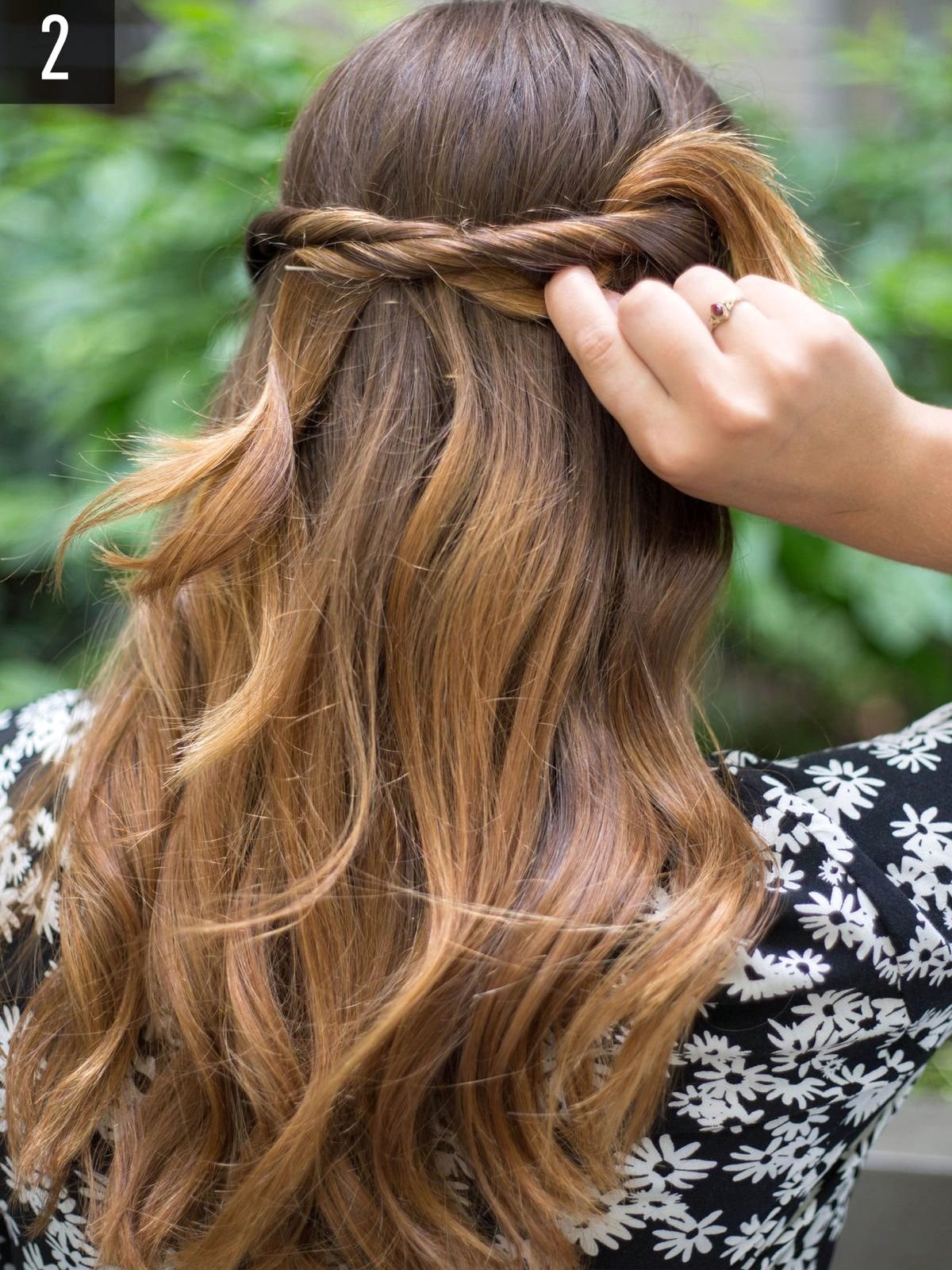 Если у вас кудрявые волосы, то такая прическа просто незаменима для вас, это простой и легкий вариант украсить прическу с распущенными волосами. Все что вам нужно это заплести две маленькие косички и сделать из них ободок, перекинув на противоположную сторону. Кончики косичек прячутся в волосах и закрепляются невидимками.