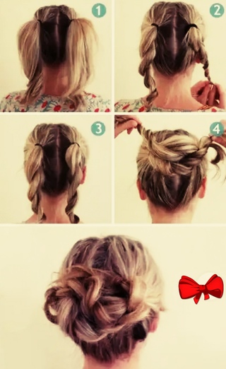 Эта причёска переживала однажды скачок популярности, но это не мешает обращаться к ней снова и снова. Пучок-бант и сегодня является сверхпопулярным. Носительницы такого пучка выглядят невероятно восхитительными и милыми. Это как раз тот случай, когда к своей женственности можно добавить еще и девичества. Соберите высокий хвост и, проворачивая волосы на последнем витке резинки, остановитесь после 10-15 сантиметров так, чтобы концы остались у вас спереди. Разделите образовавшуюся петлю пополам и разложите в виде боковинок, заводя свободные концы назад. Зафиксируйте ваш пучок-бант.