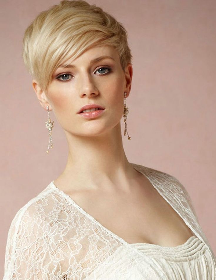 Красивой женскую стрижку пикси делает ее легкость и игривость прядей, удлиненных на затылке и макушке. Пикси конечно имеет несколько силуэтов стрижки, однако, самой популярной и красивой женской стрижкой пикси для коротких волос будет романтичный вариант с челкой.