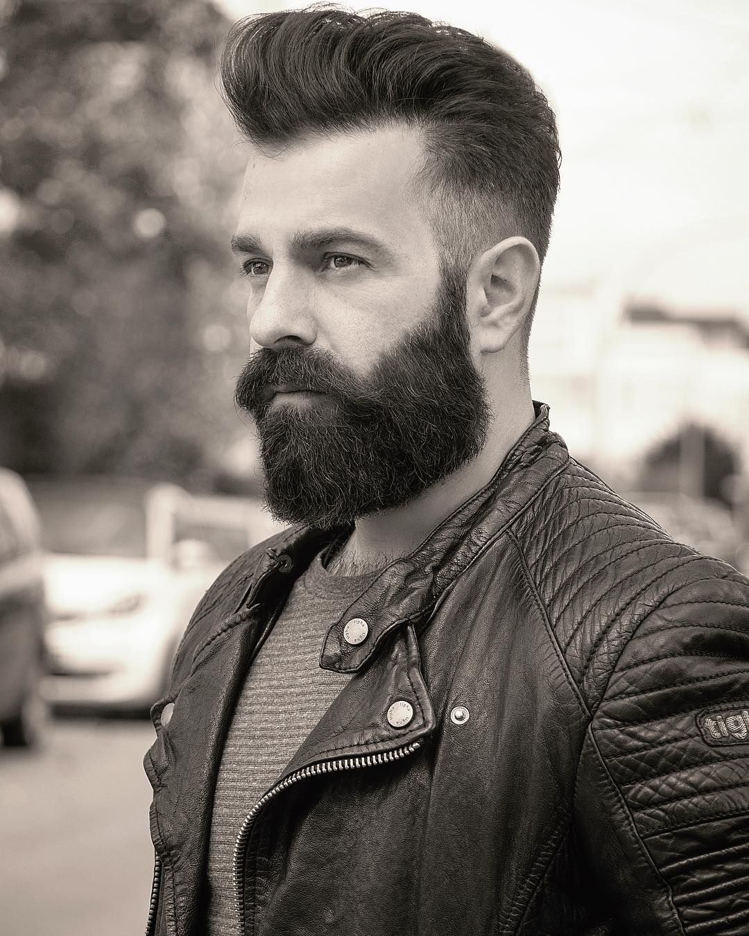 Борода байкера – она длинная небрежная, чаще всего носится со стрижкой под ноль или прической андеркат.