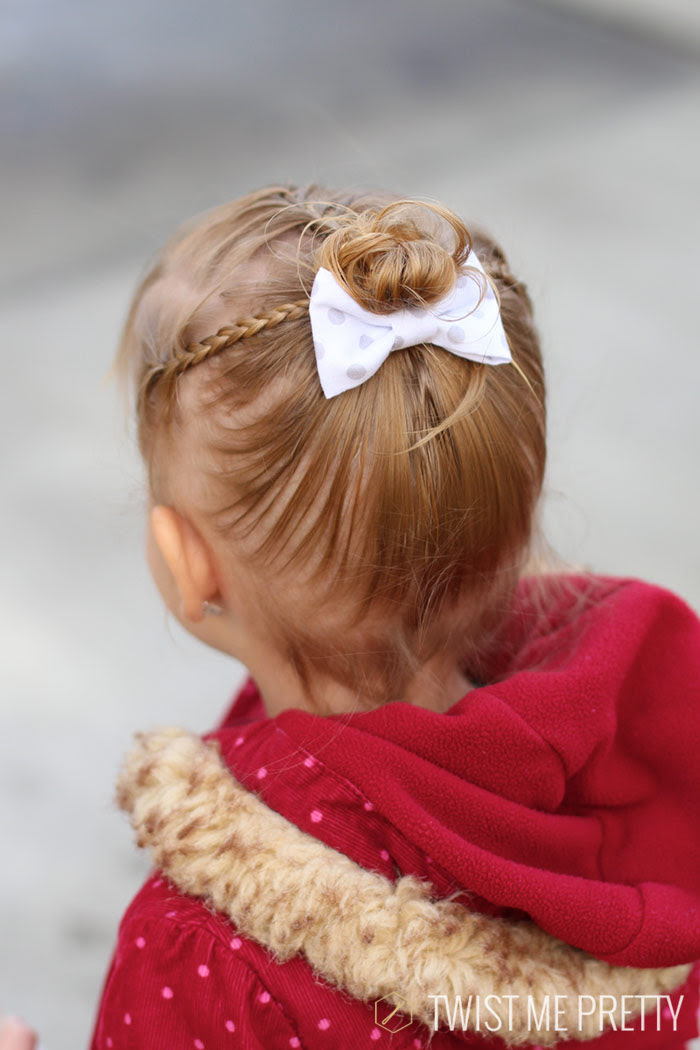 Пони с коротким боковым пробором и бантом! Можно ли было сделать еще проще? Разделите волосы ребенка на пробор; в этот момент убедитесь, что он не попадает на ее лицо, защищая его забавной застежкой. И мама, и юная леди останутся довольными до конца дня!