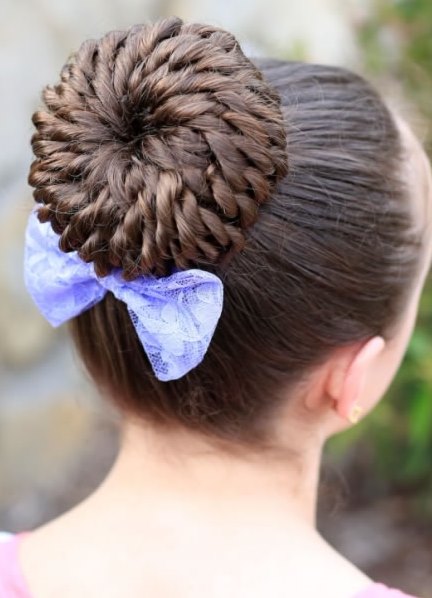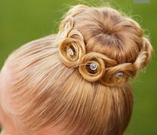 Очень милой и красивой прической с бубликом для девочки является элегантный цветочек. Если ваша малышка увидит эту модель, она обязательно попросит ее выполнить на своих волосах. Не будет преувеличением сказать о том, что такая укладка подойдет практически для любого мероприятия. Ну а если вы ее сделаете просто так в будний день, все окружающие подумают, что у вашей дочки сегодня праздник. Не может такая красота оставаться незамеченной.