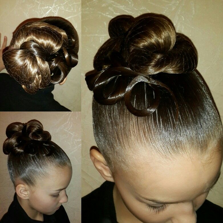 Например, ей можно сделать простую, но красивую прическу своими руками с парикмахерским “бубликом”, размер которого должен зависеть от возраста и длины волос девочки. Сразу же оговоримся, что такой вариант прически для участия в конкурсах бальных танцев подойдет и взрослым танцовщицам.