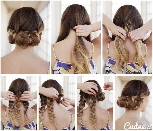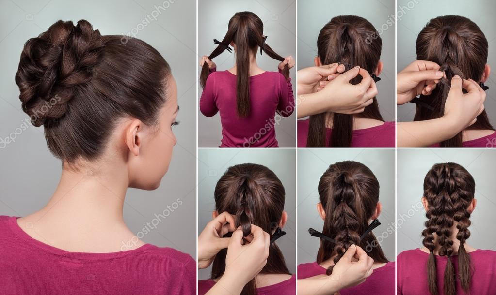 Данная прическа выручит, если быстро нужно собрать дочку на танцевальный кружок или спортивные соревнования. Заплетите конский хвост, у основания расположите широкую резинку или валик. Проденьте тонкую прядь под низ, из верхней части отделите две такие же и начинайте постепенно плести косичку вокруг резинки повторяя действия. Кончик спрячьте внизу и заколите невидимкой.