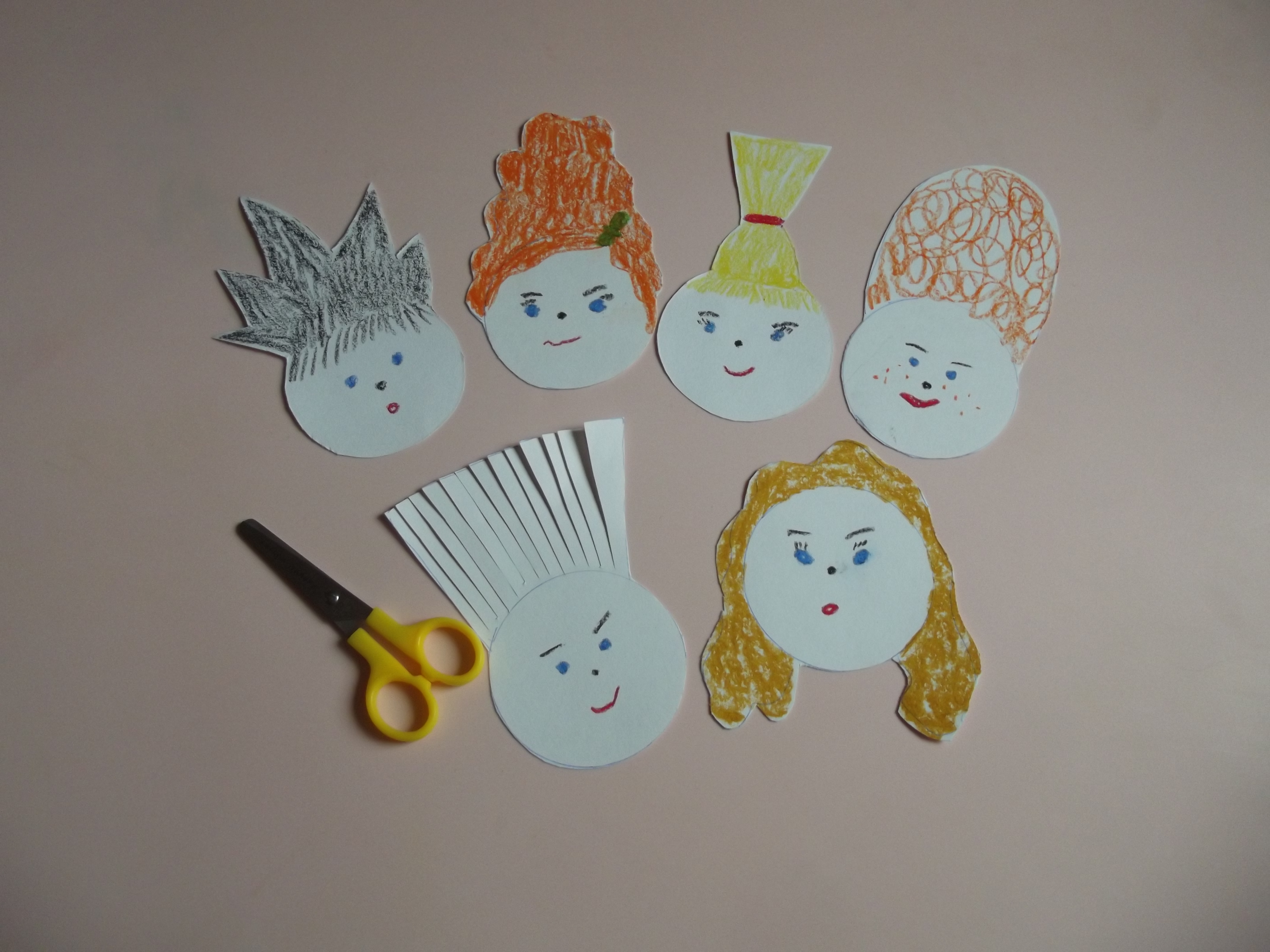 Обдумываем форму прически. Это хороший метод для тренировки детского воображения. Вырезаем прически с очертаниями пышных, вьющихся волос, хвостики, «пальмочки», челки и загривки — все, чего пожелает фантазия малыша. Прорисовываем маркером детали внутри прически, прорезаем тонкие элементы, если того требует замысел.