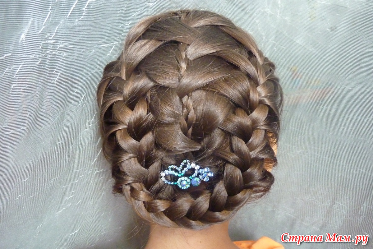 10. Вот как укладка выглядит сверху. Концы косичек с резинками полностью спрятаны под ободком. Плетеный обруч закреплен шпильками. На задней части головы видно как красиво уложены локоны друг на друга. В конце нужно обработать прическу лаком для волос, чтобы она хорошо держалась.